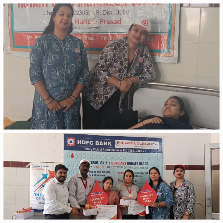 ऋषिकेश, 14 नवंबर ।रोटरी क्लब ऋषिकेश दिवास ने एच डी एफ सी बैंक के सहयोग से सीमा डेंटल कॉलेज में रक्तदान शिविर का आयोजन किया, जिसमें कॉलेज के120 छात्र छात्राओं ने पंजिकरण करवा दिया 80 यूनिट ब्लड दान किया।