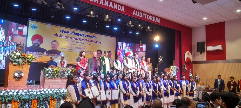 दीक्षांत समारोह में राज्यपाल, उत्तराखण्ड और विश्वविद्यालय के कुलाधिपति ले जरनल गुरमीत सिंह (से नि) मुख्य अतिथि , दीक्षान्त समारोह के अतिविशिष्ट अतिथि प्रदेश के उच्च शिक्षा मन्त्री उत्तराखण्ड सरकार डॉ० धन सिंह रावत एवं वित्त मन्त्री उत्तराखण्ड सरकार प्रेमचन्द अग्रवाल ने दीक्षान्त समारोह में विशिष्ट अतिथि के रूप में प्रतिभाग किया।