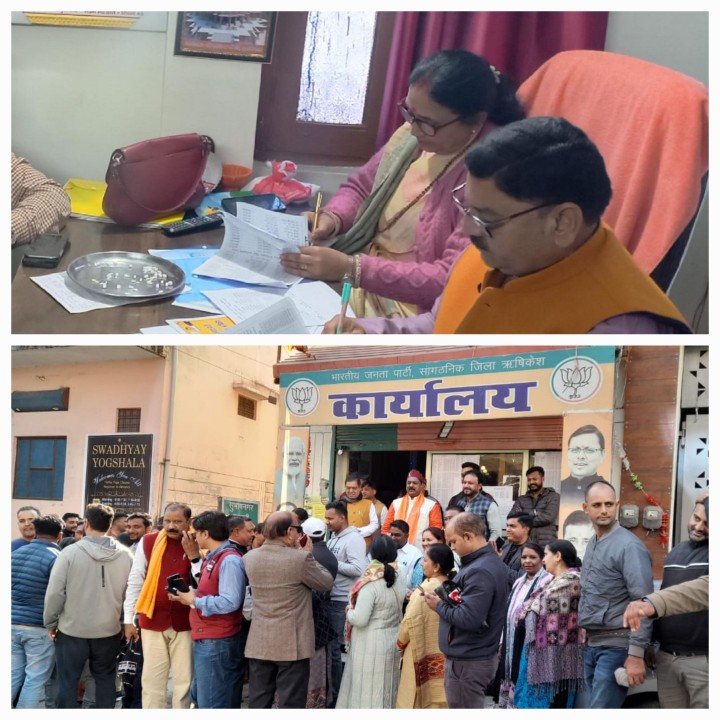 ऋषिकेश, 19 दिसंबर। आगामी माह में ऋषिकेश नगर निगम के होने वाले संभावित चुनाव के मध्य नजर भारतीय जनता पार्टी कार्यालय में अभी तक मेयर व पार्षद पद के उम्मीदवारों के प्राप्त हुए आवेदन पत्रों को लेकर पार्टी ने देहरादून से भेजे गए पर्यवेक्षकों ने रायशुमारी की।