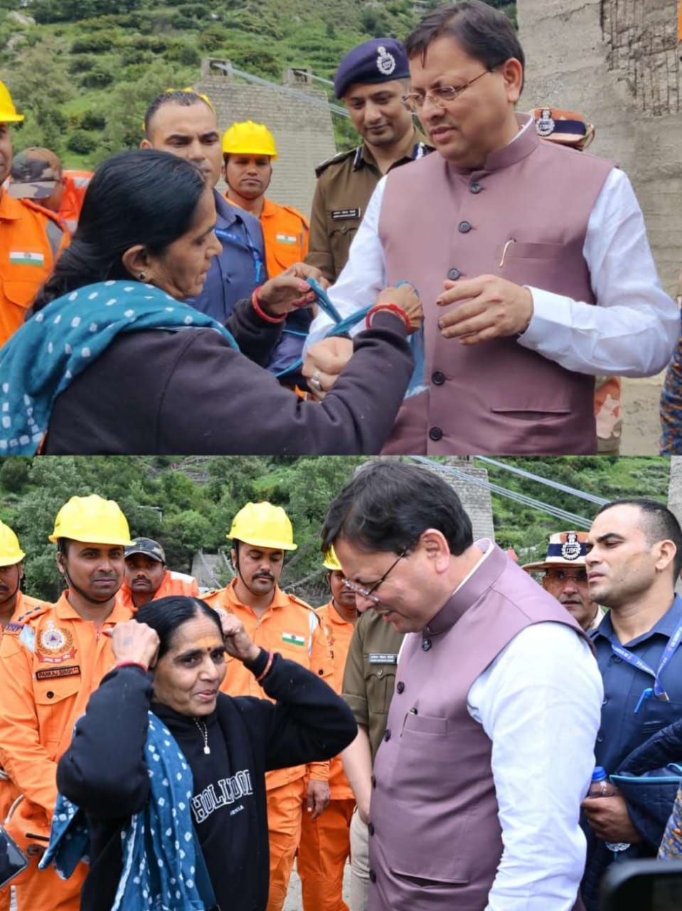 धराली क्षेत्र में आई आपदा के बाद राहत और बचाव कार्यों का निरीक्षण कर रहे मुख्यमंत्री के सामने आया एक अत्यंत भावुक कर देने वाला दृश्य, गुजरात से आई महिला श्रद्धालु ने भावुक होकर अपने दुपट्टे का टुकड़ा फाड़कर राखी के रूप में मुख्यमंत्री पुष्कर सिंह धामी को बांधा, वहां उपस्थित सभी लोगों की आंखें हुई नम