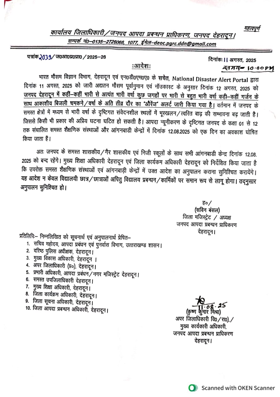 जिलाधिकारी देहरादून सविन बंसल ने बताया कि आपदा न्यूनीकरण के दृष्टिगत जनपद के कक्षा 01 से 12 तक संचालित समस्त शैक्षणिक संस्थाओं और आंगनबाडी केन्द्रों में दिनांक 12.08.2025 को एक दिन का अवकाश घोषित किया जात है।