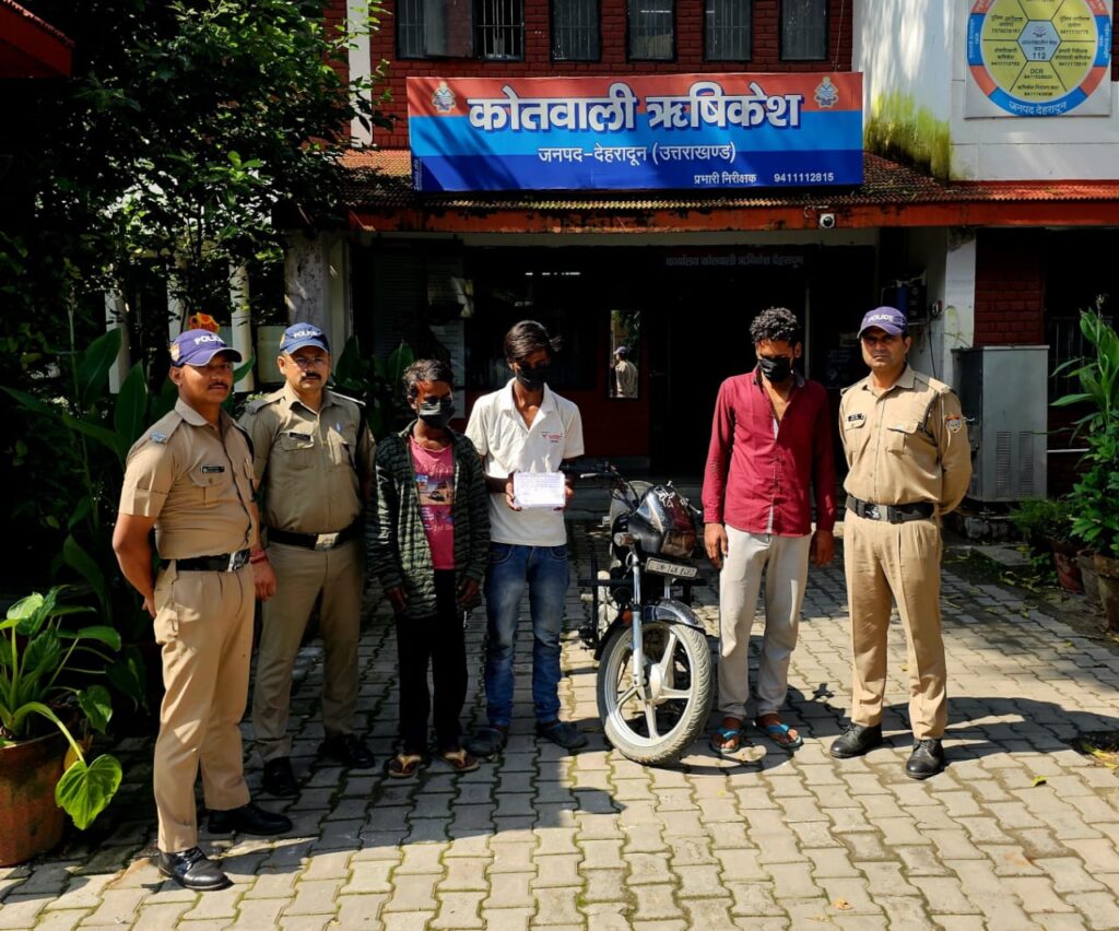 02-अमन राजभर पुत्र चन्द्रमा निवासी C/O विपिन गुमानीवाला निकट मंशा देवी मंदिर ऋषिकेश देहरादून उम्र – 22 वर्ष । 03-महावीर पुत्र सुशील सैनी हाल पता गुमानीवाला निकट मशां देवी मंदिर ऋषिकेश देहरादून मूल पता ग्राम ठसका थाना मंगलौर तहसील रूड़की जिला हरिद्वार उम्र 27 वर्ष बरामद माल मोवाइल व घटना मे प्रयुक्त मोटर साइकिल मोटर साइकिल न0-यू0के0-14के0-2480 चेसिस न0 MBLHAW115NHM86260 के साथ गिरफ्तार किया गया।